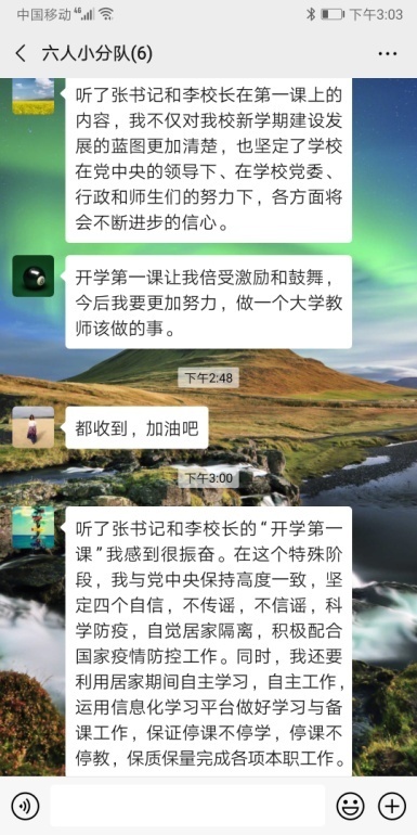 中国近现代史纲要教研部教师展开讨论,抒发自己的感想。“看了开学第一课,如李校长所讲,这是最宅的假期,宅了这么久,看到书记、校长,聆听他们的讲话,倍感亲切,倍感温暖,怀念校园!感谢学校领导对全校师生的关怀,坚守一片净土。感动于在不同的地方、不同的岗位但同样地奋战于抗疫前线的东林人,他们彰显了东林精神和风采,向他们致敬。停课不停教,坚决服从学校的安排,努力钻研在线授课技术,以立德树人为使命,以饱满的精神状态、以严谨负责的精神,认真履行教师职责,保质保量完成教学任务。”